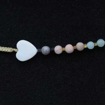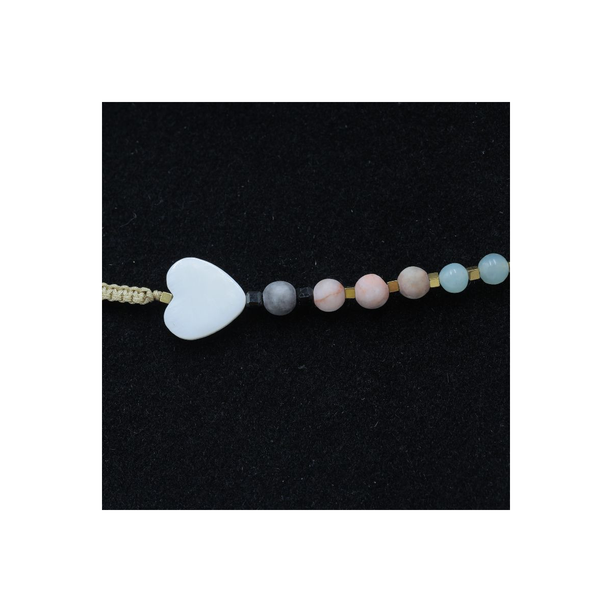 Wyjątkowa bransoletka wykonana techniką makramy, na regulowanym sznurku, łączy w sobie piękno naturalnych minerałów i symbolikę serca z masy perłowej.